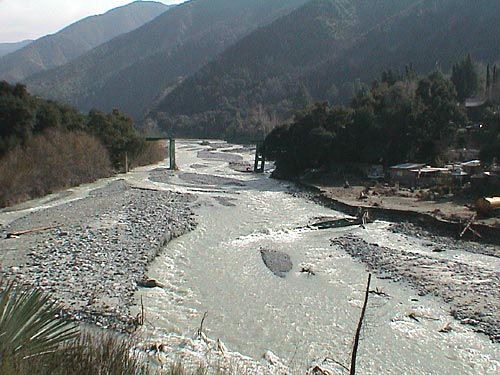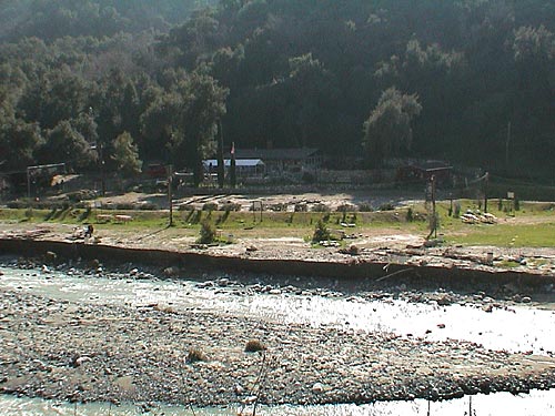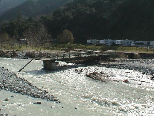 Washed-out roadway (in foreground) drops vertically about 8 feet to riverbed.